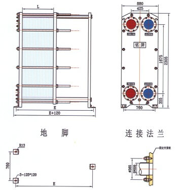 框架包括一個(gè)固定壓緊板和一個(gè)活動(dòng)壓緊板,由上導(dǎo)桿與下導(dǎo)桿支承,在另‘端有一支柱。壓制成的波紋板片懸掛在兩板之間的上導(dǎo)桿上,移動(dòng)活動(dòng)壓緊板將板片組壓緊,再用一組夾緊螺柱將固定壓緊板和活動(dòng)壓緊板夾緊至一定尺寸。兩種介質(zhì)經(jīng)固定(或活動(dòng))壓緊板上法蘭孔流入由波紋板片組成的各自通道,熱交換后介質(zhì)再由固定(或活動(dòng))壓緊板上的法蘭孔流出。同定壓緊板、活動(dòng)壓緊板、支柱及導(dǎo)桿均為低碳鋼。考慮到用戶的多種使用要求,框架設(shè)計(jì)有多種型式,主要有雙支撐框架式和常用的落地式等,也可根據(jù)用戶的要求更改框架的型式。